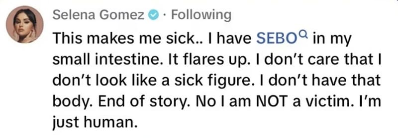 “Esto me enferma. Tengo SIBO en mi intestino delgado. A veces se agrava”, reveló en noviembre de 2024 mediante un comentario en TikTok ya eliminado.