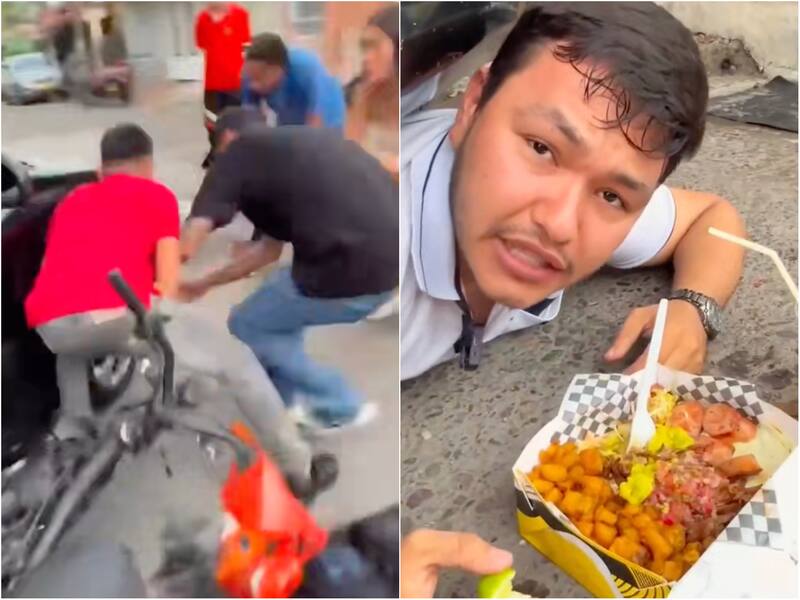 En ese momento, el individuo que está en el suelo (debajo del vehículo) mira hacia la cámara con una sonrisa, con una caja de salchipapas justo frente a él.