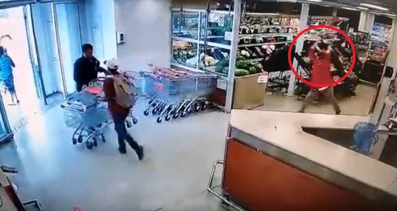 Decenas de usuarios de redes sociales comparten el registro grabado por una cámara de un supermercado que muestra el robo frustrado que protagonizo un violento mechero.