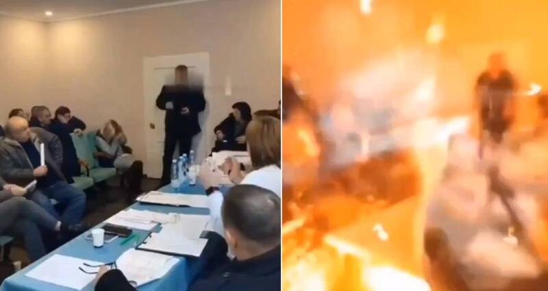 Un impactante video da cuenta del momento exacto en que un concejal ucraniano detona varias granadas dentro del municipio de la localidad de Keretsk.