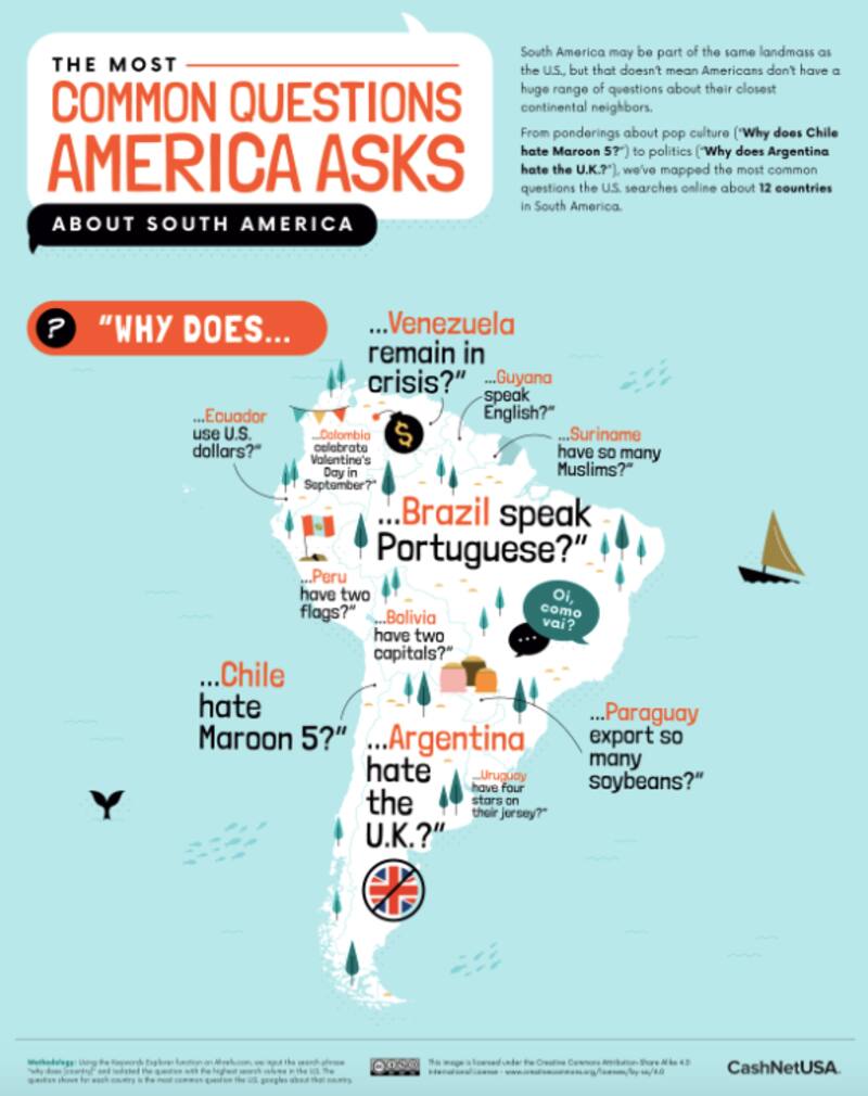 Como dato, en Sudamérica somos el único país con una pregunta farandulera, ya que sobre nuestros vecinos las dudas son sobre idioma, economía y política: “¿Por qué Brasil habla portugués?”, “¿Por qué Paraguay exporta tanta soja?” y “¿Por qué Argentina odia al Reino Unido?”.