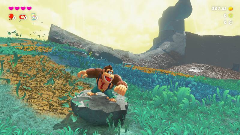 Punto aparte es dejado para el apartado gráfico, partiendo por el nuevo modelo de Donkey Kong, inspirado en la película de Super Mario, y el mundo a nuestro alrededor, que es colorido y lleno de cosas brillantes que, en este caso, son los bienes que recolectamos, como oro, fósiles y otros artículos que servirán para ir desbloqueando habilidades o cosméticos.