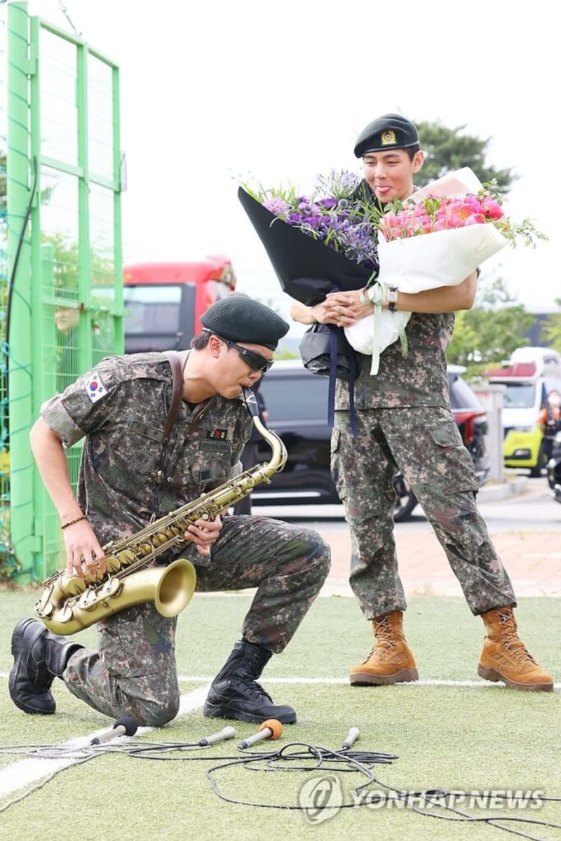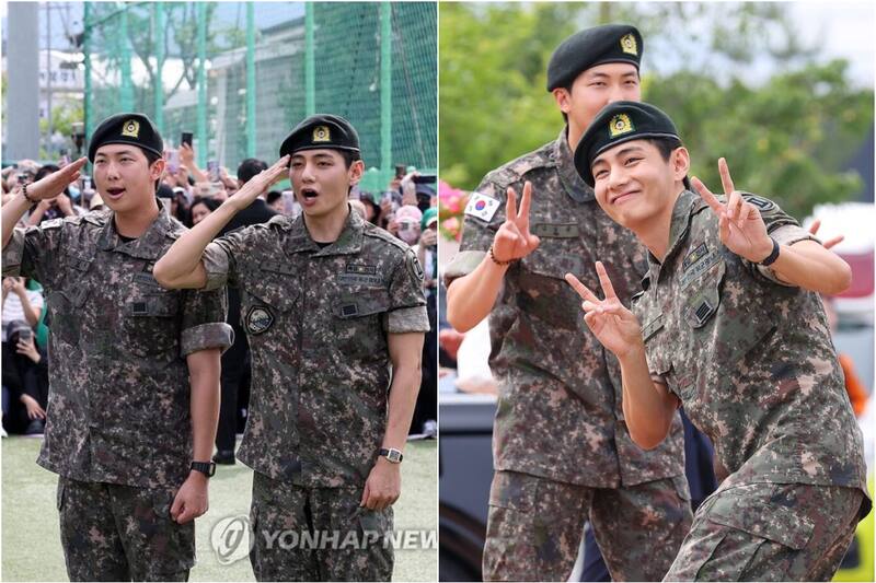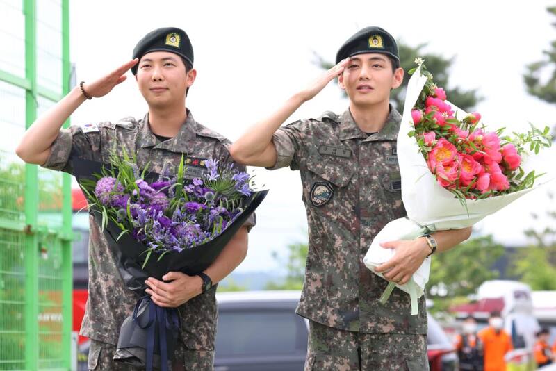 V, quien durante su servicio fue parte de la unidad de misión especial de la Policía Militar y alcanzó el rango de sargento, y Rm, quien sirvió en la 15va División de Infantería y formó parte de la Banda Militar, fueron recibidos con flores frente a la prensa y algunas fans que se encontraban en el lugar.