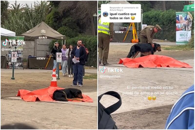 Rápidamente más de alguno, como Emilia, sacó su celular, probablemente intuyendo que podía ocurrir algo como lo que en definitiva sucedió: no contento con robarles el protagonismo a los uniformados, el simpático can decidió tomarse un minuto de descanso… ¡encima del “muerto”!