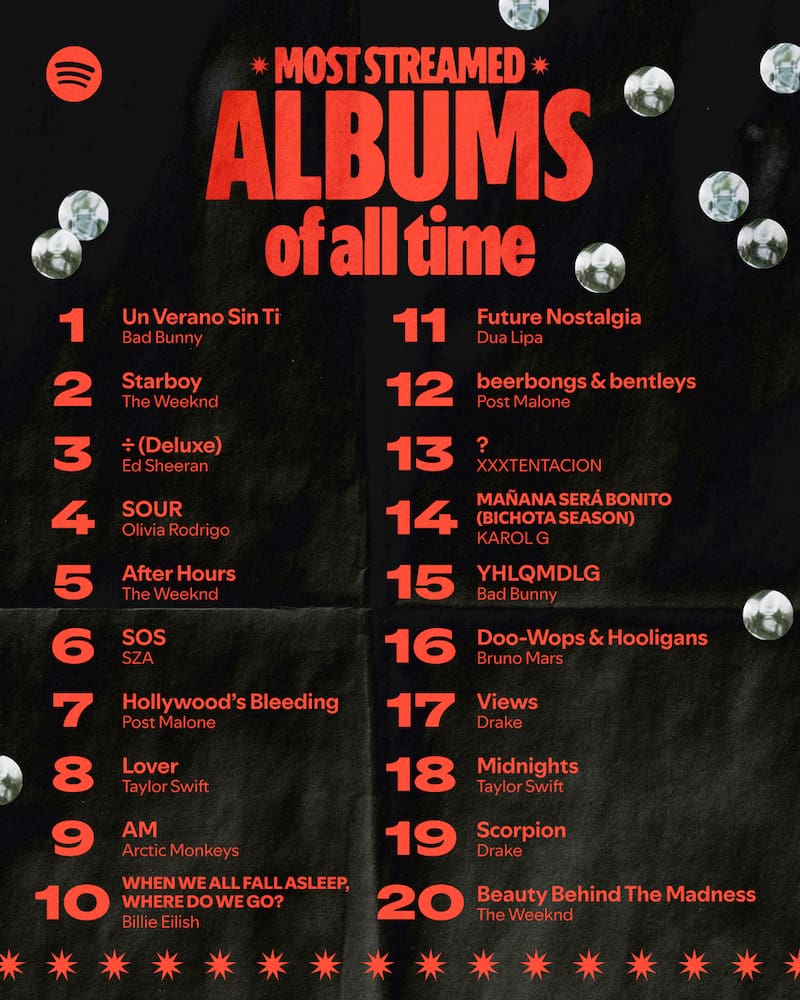 A la hazaña le sigue Starboy de The Weeknd, ÷ (Deluxe) de Ed Sheeran, SOUR de Olivia Rodrigo y After Hours, nuevamente de The Weeknd. Taylor Swift, a pesar de ser la artista más escuchada, solo logró el lugar número 8 con su disco Lover y el 18 con Midnights.