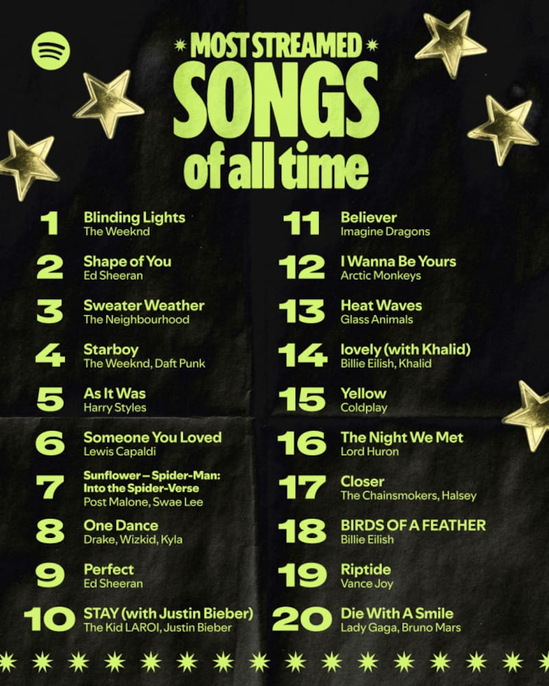 En cuanto a canciones, la más popular en estos últimos 20 años fue Blinding Lights de The Weeknd, seguida de Shape of You de Ed Sheeran, Sweater Weather de The Neighbourhood, Starboy de The Weeknd y Daft Punk y en quinto lugar As It Was de Harry Styles. Curiosamente, ninguna de las 20 canciones más escuchadas es latina.