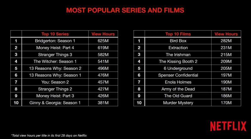 El podio de las series es liderado por la primera temporada de Bridgerton, con más de 82 millones de cuenta viéndola. Le siguen la primera parte de Lupin y la temporada inicial de The Witcher.