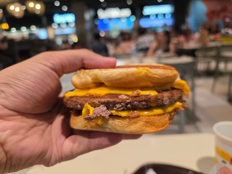 Sus ingredientes son mayonesa, 3 láminas de queso cheddar, carne, tocino, cebolla crispy y ketchup, lo que en su conjunto hace que la hamburguesa sea más bien dulce y de sabor suave que de otra cosa.