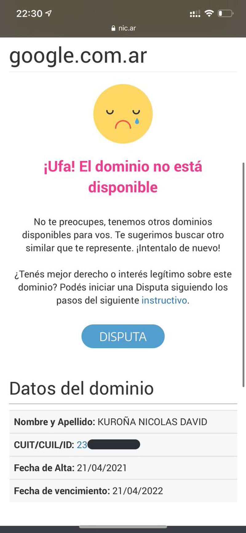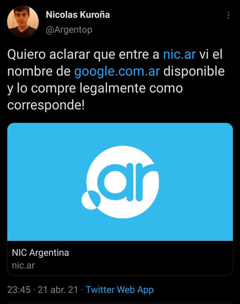 Nicolás, el nuevo propietario, explicó luego en su Twitter, @Argentop: "Quiero aclarar que entré a nic.ar, vi el nombre de google.com.ar disponible y lo compré legalmente, como corresponde".