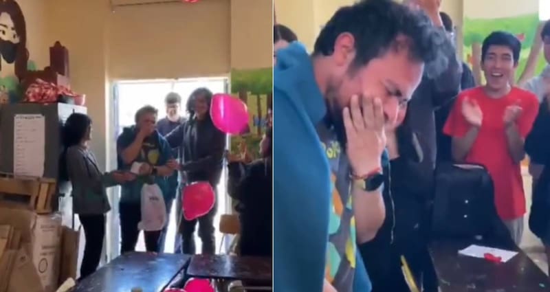 Y ya que todo estaba perfectamente planificado, el docente llegó a la sala en compañía de un pequeño grupo de alumnos. Ya al interior, el resto de la clase le gritó “¡feliz día!”.
