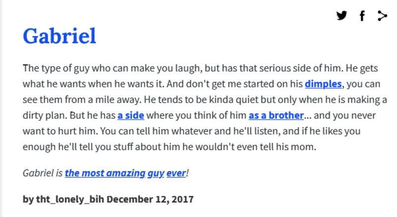 "El tipo de chico que puede hacerte reír, pero tiene un lado serio. Obtiene lo que quiere cuando lo quiere", dice por ejemplo la respuesta de la búsqueda del nombre Gabriel.