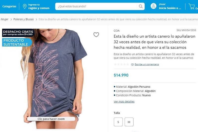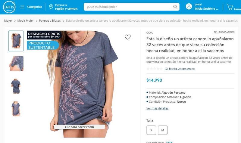 Por ejemplo, un artículo de la sección poleras y blusas tenía la siguiente descripción: "Esta la diseñó un artista canero lo apuñalaron 32 veces antes de que viera su colección hecha realidad, en honor a él la sacamos".