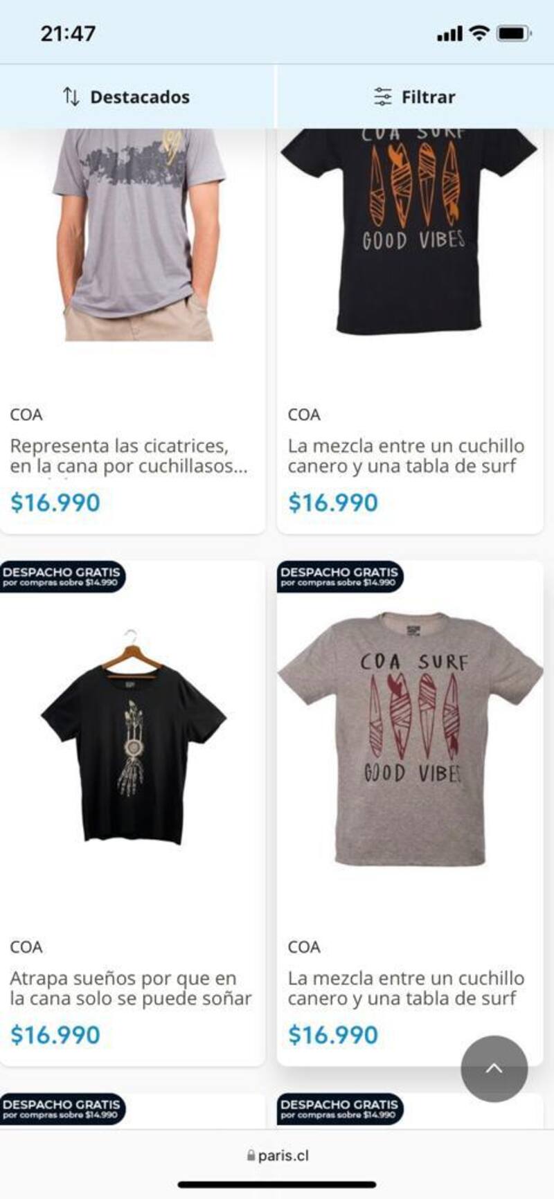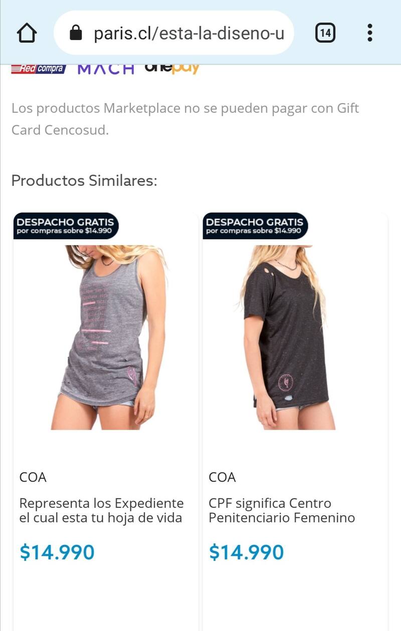 Según se puede constatar en las imágenes, los productos aparecieron en el Marketplace de Tiendas París. Forman parte de productos de la marca COA Surf, quienes en su sitio oficial explican que: "en estos diseños se trabajo con la convergencia entre la cárcel y la libertad para contraponer estos conceptos".