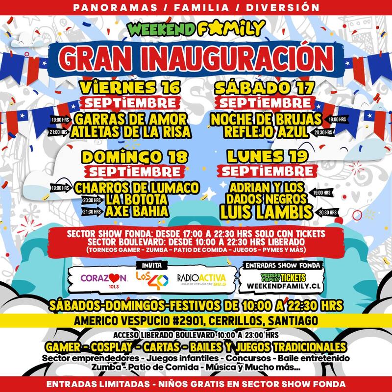 Como una instancia para inaugurar este espacio con bombos y platillos, Weekend Family anunció que realizará una gran fonda los días 16 al 19 de septiembre, de 10:00 a 22:30 horas en Américo Vespucio 2901, comuna de Cerrillos.