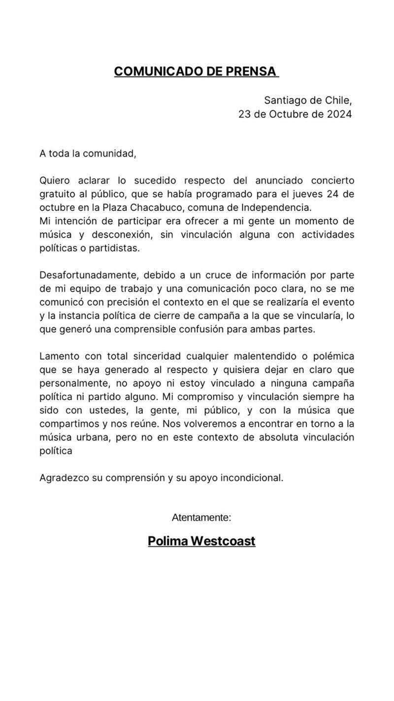 “Quiero aclarar todo lo sucedido respecto del anunciado concierto gratuito que se había programado para el jueves 24 de octubre en la Plaza Chacabuco, comuna de Independencia. Mi intención de participar era ofrecer a mi gente un momento de música y desconexión, sin vinculación alguna con actividades políticas o partidistas”, comenzó.