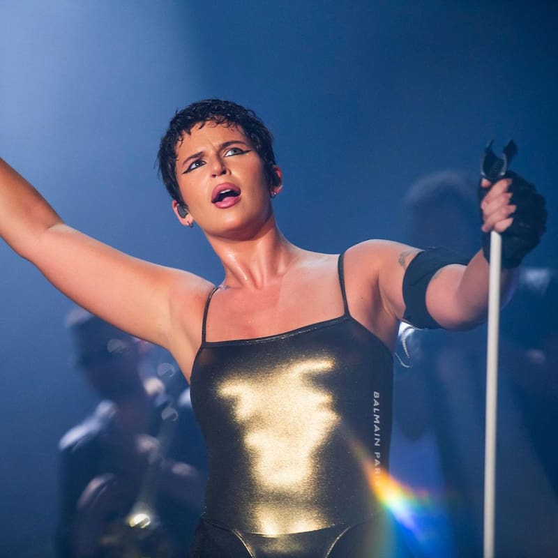 La estrella además cantó dos covers: “La despedida” de Daddy Yankee, y “Vivir así es morir de amor”, de Camilo Sesto; y también su última canción estrenada hace unos días, “Estás buenísimo”. Talento latino y candela enfundada en un body metalizado, plataformas de infarto, cabello cortísimo, un ojo marrón y otro color cielo.